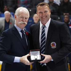 2018 Inductee Martin Brodeur receives his Honoured Members blazer and Tissot watch from Hockey Hall of Fame Chairman of the Board Lanny McDonald. (Mark Blinch/Hockey Hall of Fame)