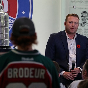 A young fans asks 2018 Inductee Martin Brodeur a question during the 2018 Canadian Tire Inductee Fan Forum. (Dave Sandford/Hockey Hall of Fame)