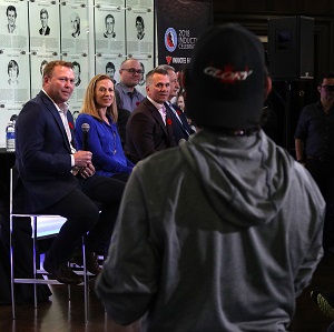 2018 Inductees Martin Brodeur, Jayna Hefford, Martin St. Louis and Aleksander Yakushev look on as a young fan asks a question during the Canadian Tire Inductee Fan Forum. (Dave Sandford/Hockey Hall of Fame)