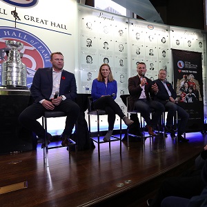 2018 Inductee Martin St. Louis answers questions while fellow inductees Martin Brodeur, Jayna Hefford and Aleksander Yakushev look on during the 2018 Canadian Tire Inductee Fan Forum. (Dave Sandford/Hockey Hall of Fame)