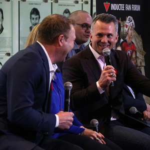 2018 Inductees Martin St. Louis and Martin Brodeur having a laugh during the 2018 Canadian Tire Inductee Fan Forum. (Dave Sandford/Hockey Hall of Fame)