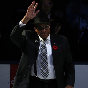 2018 Inductee Willie O'Ree is introduced to the crowd prior to the 2018 Hockey Hall of Fame Game. (Dave Sandford/Hockey Hall of Fame)
