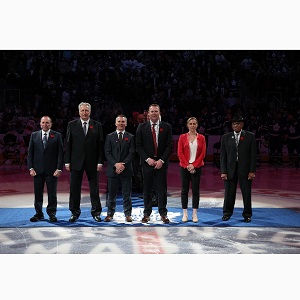 2018 Inductees Gary Bettman, Aleksander Yakushev, Martin St. Louis, Martin Brodeur, Jayna Hefford and Willie O'Ree are introduced to the crowd prior to the 2018 Hockey Hall of Fame Game. (Dave Sandford/Hockey Hall of Fame)