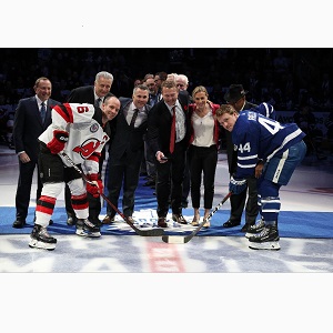 The 2018 Inductees take part in ceremonial face-off with Andy Greene of the New Jersey Devils and Morgan Rielly of the Toronto Maple Leafs prior to the 2018 Hockey Hall of Fame Game. (Dave Sandford/Hockey Hall of Fame)