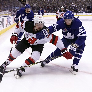 Nikita Zaitsev of the Toronto Maple Leafs battles against Marcus Johansson of the New Jersey Devils during 2018 Hockey Hall of Fame Game. (Dave Sandford/Hockey Hall of Fame)