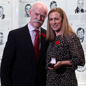 2018 Inductee Jayna Hefford receives her Honoured Members ring from Hockey Hall of Fame Chairman of the Board Lanny McDonald. (Dave Sandford/Hockey Hall of Fame)
