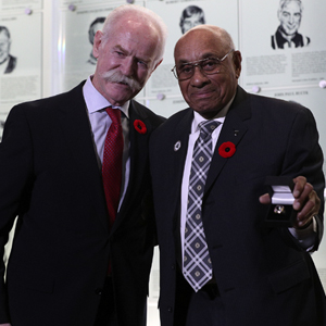 2018 Inductee Willie O'Ree receives his Honoured Members ring from Hockey Hall of Fame Chairman of the Board Lanny McDonald. (Dave Sandford/Hockey Hall of Fame)