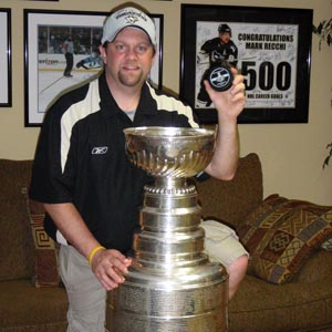 JULY 1 - Penguins head equipment manager Dana Heinze shares a moment with the Stanley Cup at his home. (Mike Bolt/HHOF)