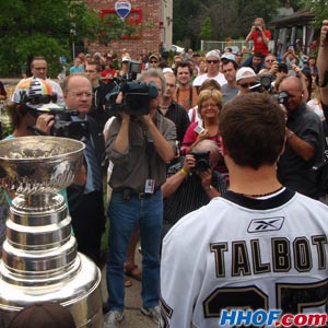 JULY 31 - Maxime Talbot answers questions outside city hall in St. Bruno, QC. (Mike Bolt/HHOF)