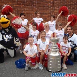 JULY 31 - Maxime Talbot, Iceberg the Penguins mascot and the local cheerleaders from St. Bruno, QC pose for a photo with the Stanley Cup. (Mike Bolt/HHOF)