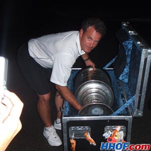 JULY 24 - Jay Heinbuck of the Penguins ends his day with the Stanley Cup. (Walt Neubrand/HHOF)