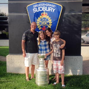 JULY 23 - Mike Yeo and his family pose for a photo with the Stanley Cup in front of the Greater-Grand Sudbury Police Station. (Walt Neubrand/HHOF)