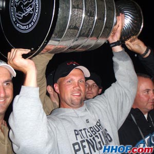 JULY 23 - Penguins assistant coach Mike Yeo proudly hoisting the Stanley Cup. (Walt Neubrand/HHOF)