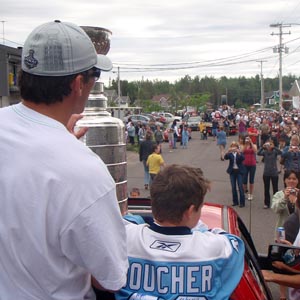JULY 5 - Philippe Boucher and his son Mathieu ride along with the Stanley Cup in a parade held in Boucher's hometown of St- Apollinaire, QC. (Walt Neubrand/HHOF)