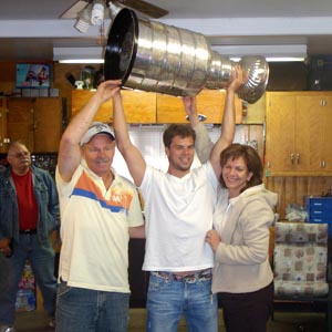 JULY 3 - Tyler Kennedy and his parents proudly hoisting the Cup at their home in Sault Ste. Marie. (Walt Neubrand/HHOF)