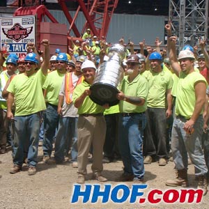 JULY 9 - The Stanley Cup stopped by to see the workers at the site of the Penguins new arena. (Walt Neubrand/HHOF)