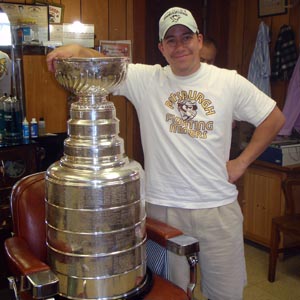 JULY 9 - Penguins assistant equipment manager Danny Kroll brought the Cup to his local barber in Pittsburgh. (Walt Neubrand/HHOF)