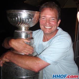 JULY 16 - Ray Shero is all smiles while sharing a moment with the Stanley Cup. (Mike Bolt/HHOF)