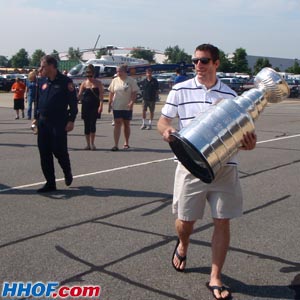 JULY 17 - Rob Scuderi arrives at the Nassau County Police Department hangar in Long Island, NY. (Mike Bolt/HHOF)