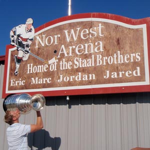JULY 21 - Jordan Staal and the Stanley Cup sharing a moment outside the Nor West Arena where he and his brothers played minor hockey. (Walt Neubrand/HHOF)