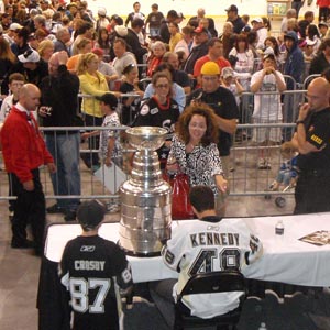 JULY 3 - Fans at the Essar Centre in Sault Ste. Marie lined up for autographs and an opportunity to get a picture taken with Tyler Kennedy and the Cup. (Walt Neubrand/HHOF)