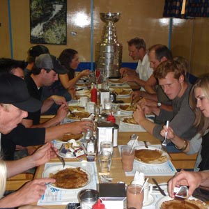 JULY 21 - Jordan Staal took the Cup to The Hoito restaurant for a pancake lunch. (Walt Neubrand/HHOF)