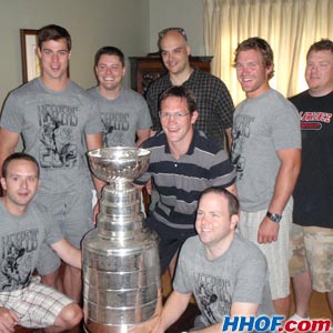 JULY 25 - Matt Cooke poses for a photo with some of his friends who made up "Cup Keeper" t-shirts in honour of Matt's day with the Stanley Cup. (Walt Neubrand/HHOF)