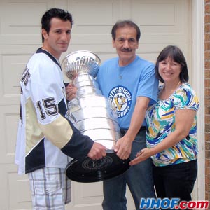 JULY 26 - Mike Zigomanis and his parent's Nick and Nikki share a photo with the Stanley Cup. (Walt Neubrand/HHOF)