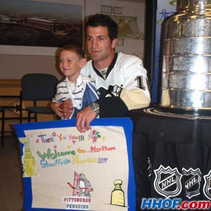 JULY 26 - Mike Zigomanis poses for a photo with a young child at the Markham Stouffville Hospital. (Walt Neubrand/HHOF)