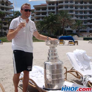 JULY 28 - Sergei Gonchar and the Stanley Cup relaxing at the beach on Fisher Island. (Mike Bolt/HHOF)