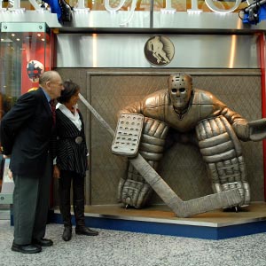 Honoured Member Johnny Bower and Gillian Danby admiring the "At the Crease" sculpture in front of the newly located Hockey Hall of Fame Spirit of Hockey retail store. (Steve Poirier/Hockey Hall of Fame)