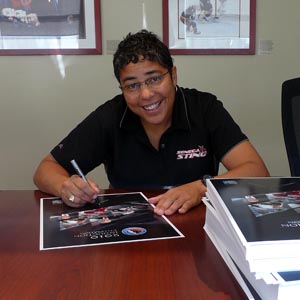 2010 Player Inductee Angela James signs induction posters that will be part of the gift bags received by guests at this year's Hockey Hall of Fame Induction ceremony. (Craig Campbell/HHOF)