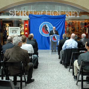 Ron Ellis of the Hockey Hall of Fame speaks at the podium during a press conference unveiling the "At the Crease" sculpture and official opening of the Spirit of Hockey retail store. (Steve Poirier/Hockey Hall of Fame)