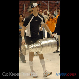 Anaheim Ducks defenseman Chris Pronger, less hockey equipment, parades the Cup around the ice at the Honda Center in Anaheim. (Phil Pritchard/HHOF)