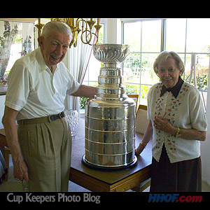 David McNab's proud parents pose with the Stanley Cup. David's father Max is reunited with the Stanley Cup, having won the trophy in 1950 with the Detroit Red Wings. (Walt Neubrand/HHOF)
