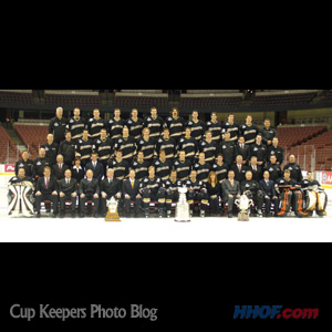 Days after their Cup victory, the Anaheim Ducks get together for the official team photo shoot with hockey's ultimate hardware. (Phil Pritchard/HHOF)