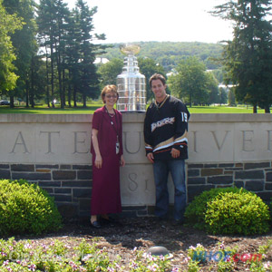 The president of Colgate University, Rebecca S. Chopp (left) and Andy McDonald (right) pose with the Cup outside the school's entrance. (Mike Bolt/HHOF)