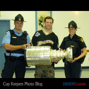Huskins poses with two members of the Ontario Provincial Police. (Mike Bolt/HHOF)