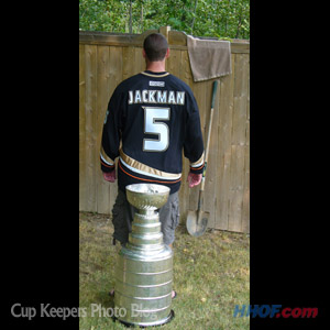 Jackman proudly sports his team's uniform in front of the Stanley Cup. (Mike Bolt/HHOF)