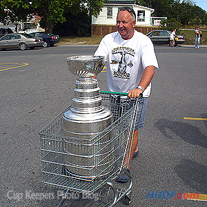 Randy Carlyle finds an easier way to transport the Cup toward a local Foodland grocery store. (Walt Neubrand/HHOF)