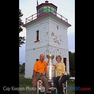 Dave Farrish and his wife take a load off on the Stanley Cup's case and pose for a photo in front of an old lighthouse. (Walt Neubrand/HHOF
