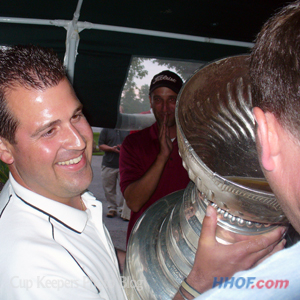 Anaheim's Head Athletic Trainer, Tim Clark kindly helps a friend sip out of the Stanley Cup. (Walt Neubrand/HHOF)