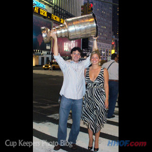 Shannon and his girlfriend Jessica (fiancee to be) tour the Stanley Cup around Times Square on Manhattan Island. (Walt Neubrand/HHOF)