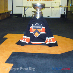 Stanley tries on the hockey sweater of the Princeton Tigers while touring the campus with George Parros. (Walt Neubrand/HHOF)