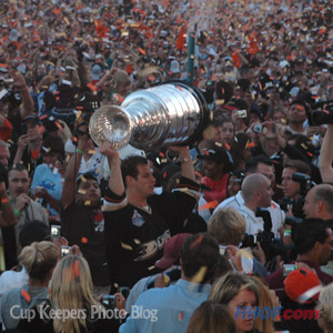 Ryan Getzlaf makes his way through the sea of fans while hoisting the Stanley Cup. (Mike Bolt/HHOF)