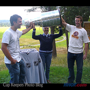 With a little help from her two sons, Carol Niedermayer hoists Stanley above her head. (Walt Neubrand/HHOF)