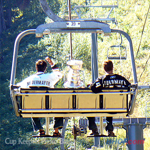 The brothers take the ski lift up a mountain at Fernie Alpine Resort for photos. (Walt Neubrand/HHOF)