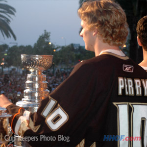 Anaheim Ducks forward Corey Perry looks on at the thousands of fans who came out to celebrate the Ducks' Stanley Cup victory. (Mike Bolt/HHOF)