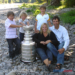 Scott Niedermayer and his family take a load off and pose for some family photos as two of the boys try to take off with Stanley. (Walt Neubrand/HHOF)