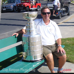 Michael Schulman, Chief Executive Officer of the Anaheim Ducks hangs out with Stanley. (Mike Bolt/HHOF)